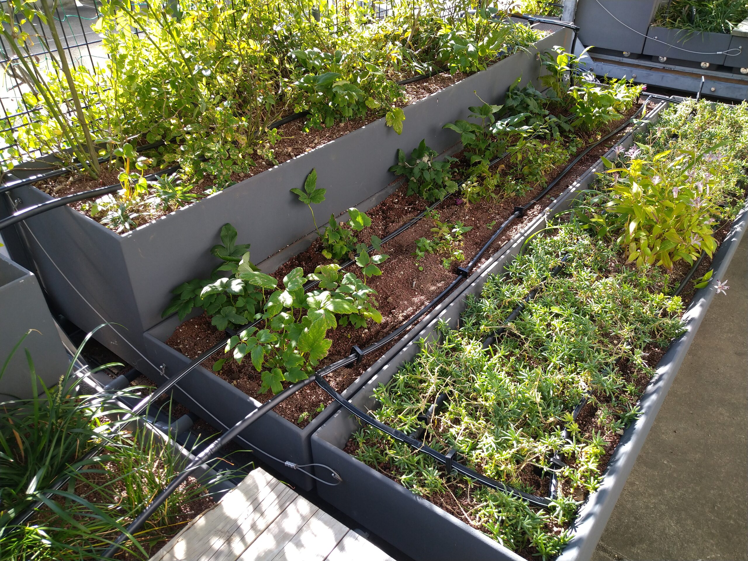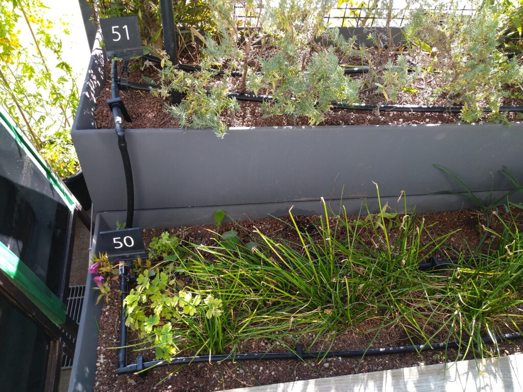 ドリップチューブの敷設距離は約 100m です。毎日の水やりが必要な花壇ですが、かん水を自動化することにより、毎日の水やり作業が簡単に行えます。