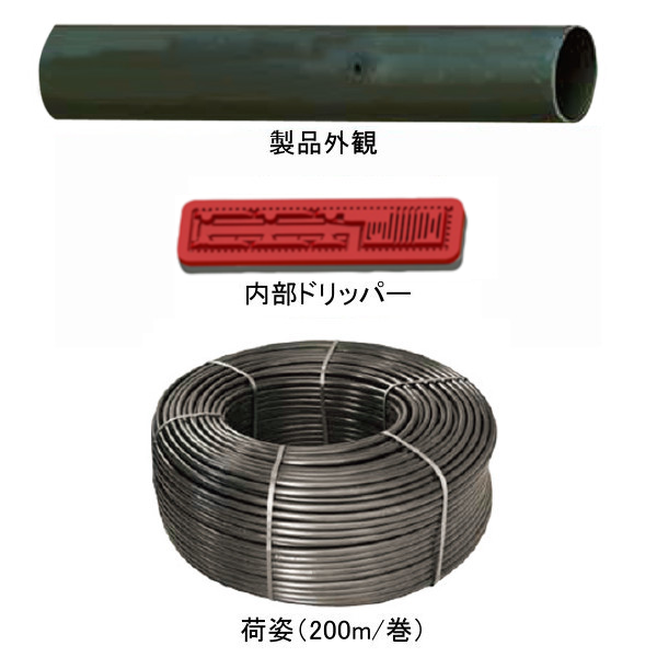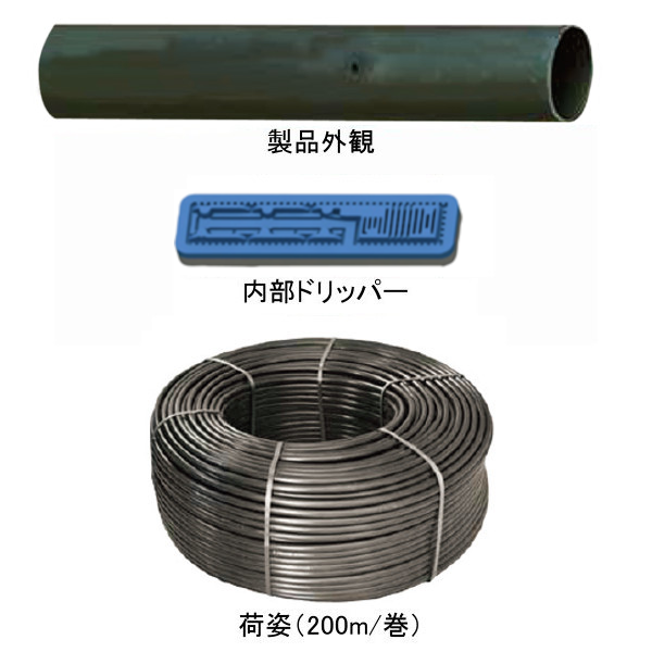 | 仕様 | ドリップ間隔:15、20、30、40、50、60、70、100cmピッチ (25、75cmピッチは数量により特注対応可能) チューブ肉厚:1.02mm(16mm/20mm) |