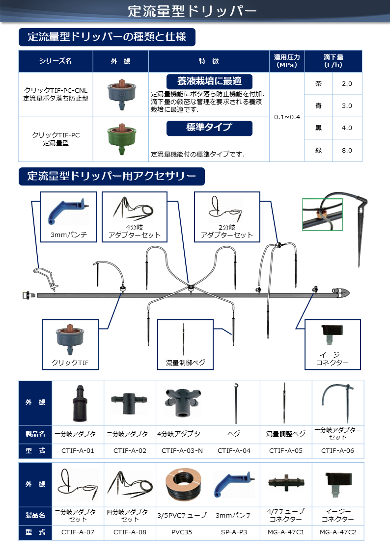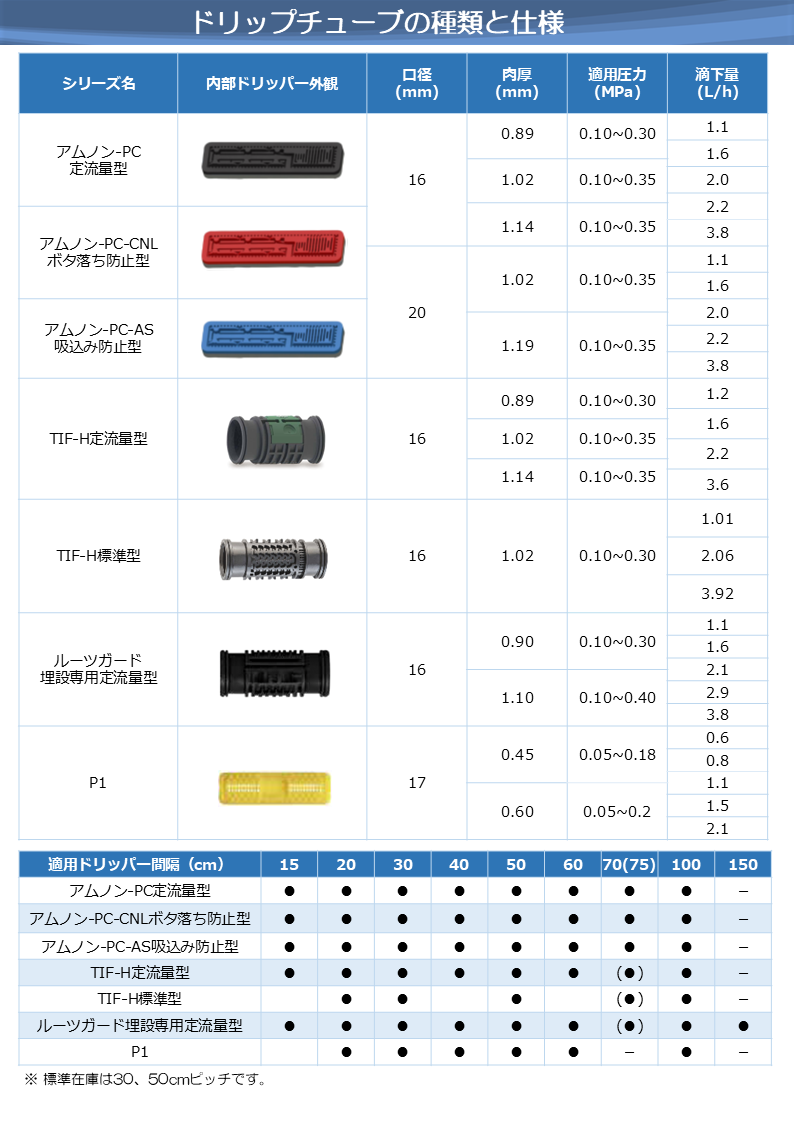 この他にも、プランターやポットなどに適したタイプ(クリックTIF)や、チューブが柔らかくローコストな(P1)、チューブが細く小規模向のタイプ(DF)があります。