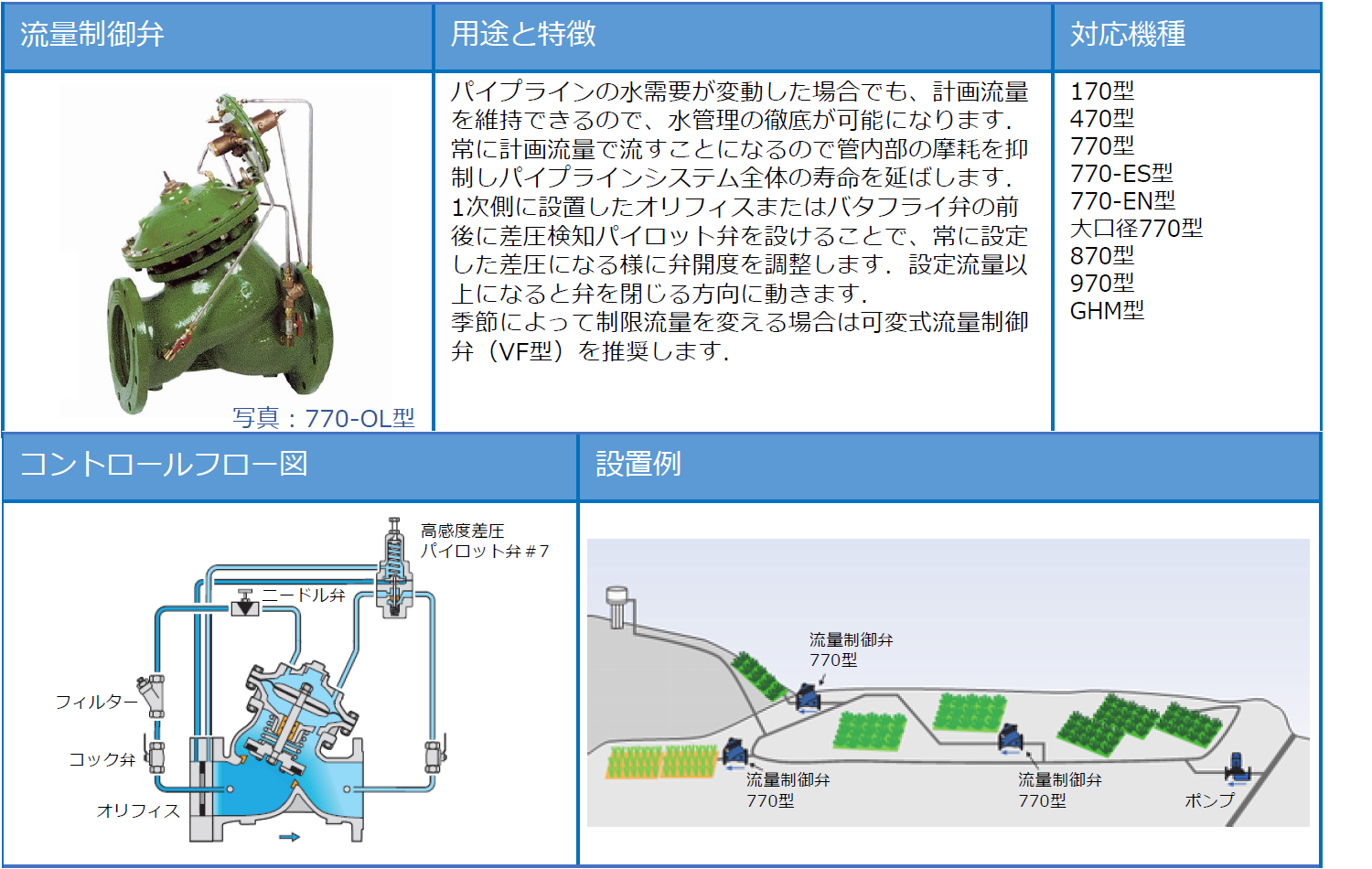 - 流量制御弁にはある一定範囲で調整可能な固定型(オリフィス制御)と季節によって使用流量が大きく変わる場合にも対応できる調整範囲の大きい可変型があります。