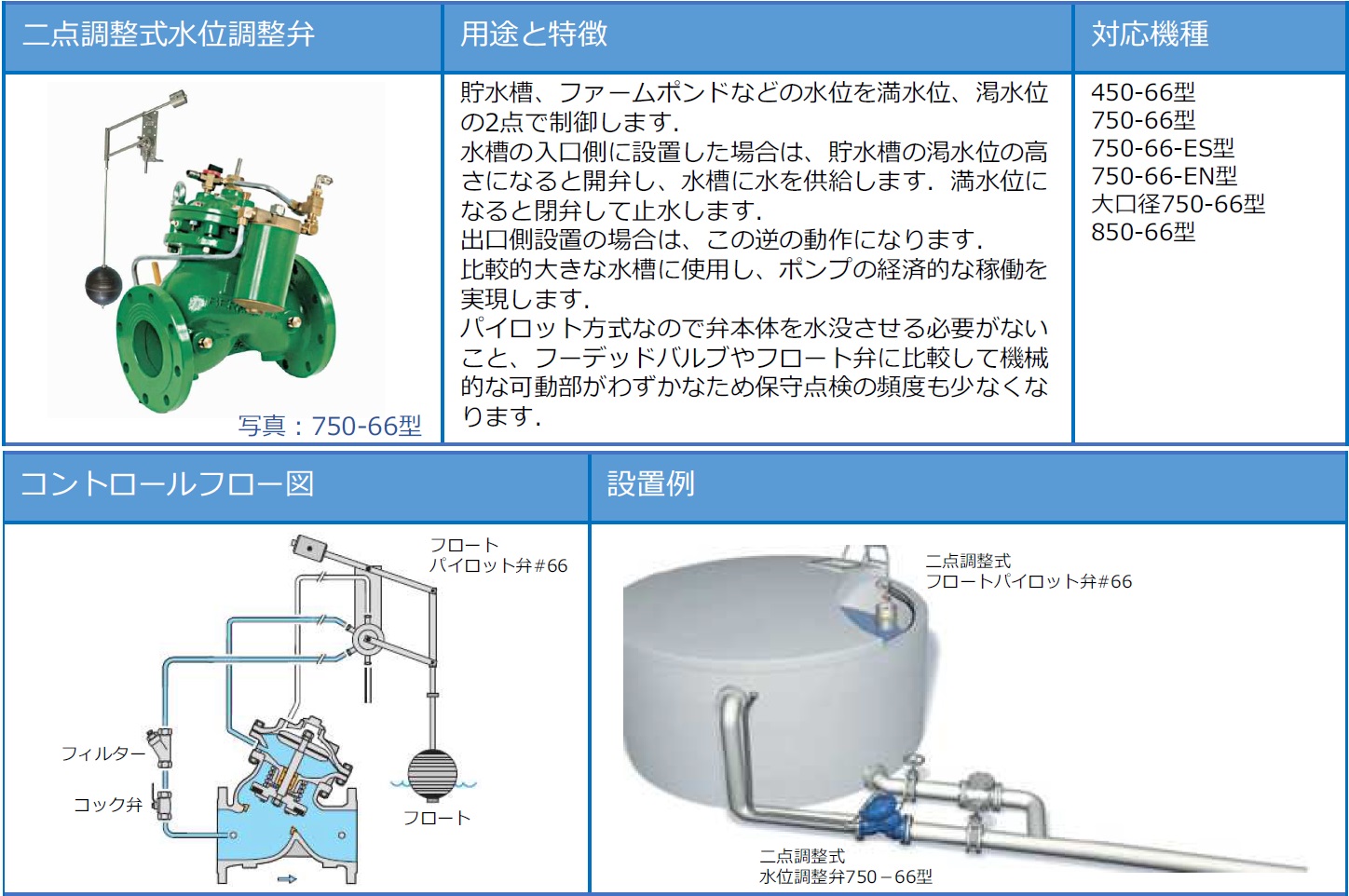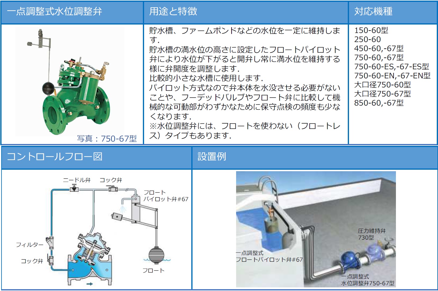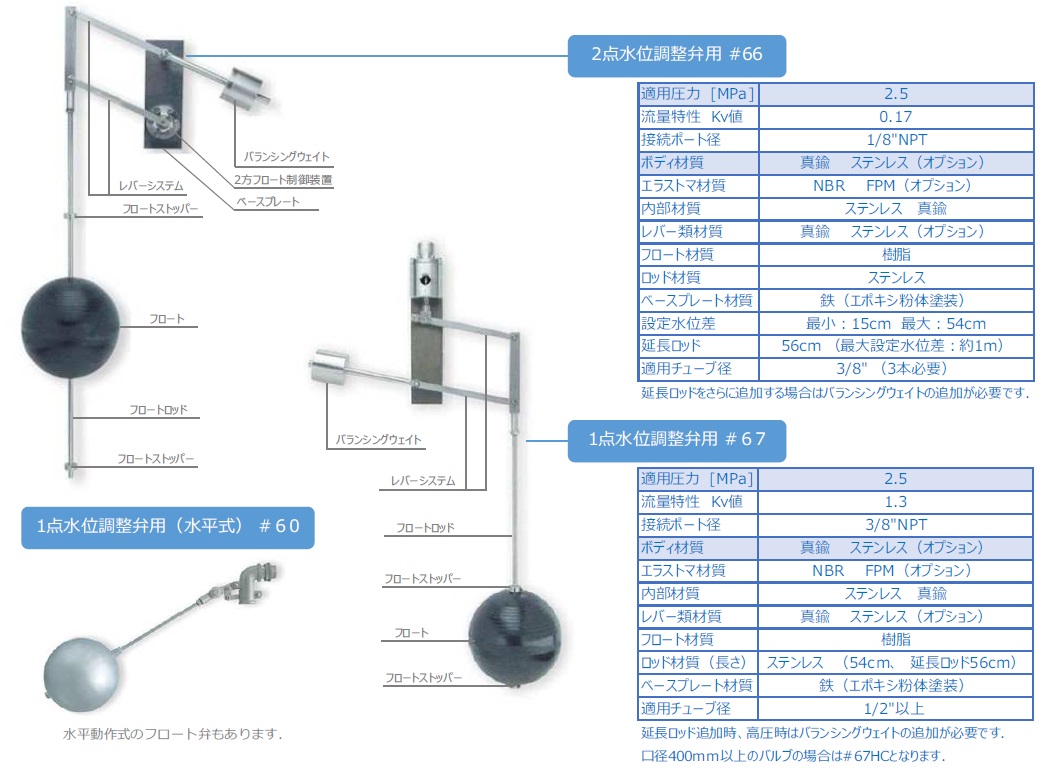 - 水位レベルのコントロールには上限水位を常に維持するように制御する一点水位調整弁と、上限と下限の二点で水位調整を行う二点水位調整弁があります。また水位を水頭圧として検出するフロートレスタイプもあります。