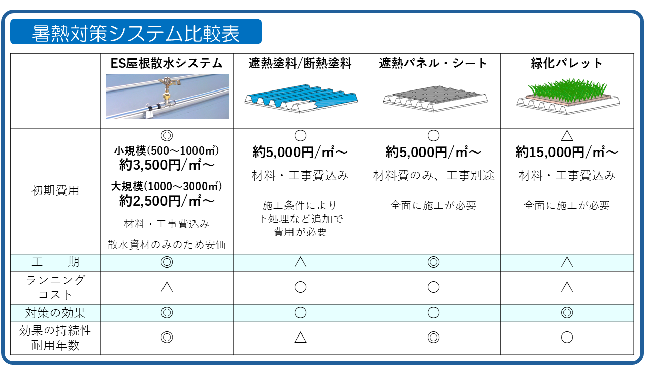 塗装やシートで遮熱する方法に比べ、屋根散水は費用・効果で優れています。下段の暑熱対策システム比較表をご覧ください。